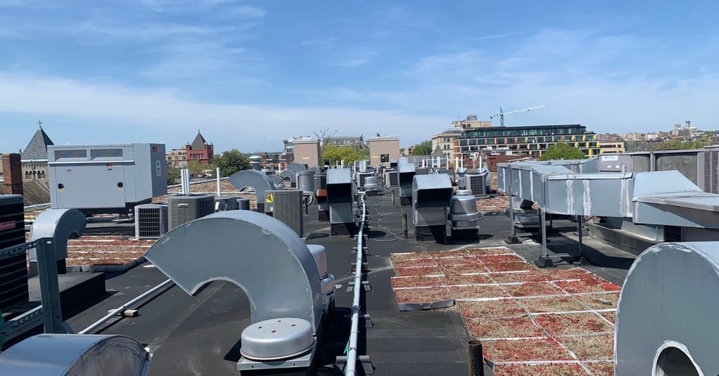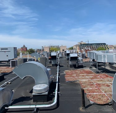 Over 140 rooftop units—including HVAC, vents, and mechanical equipment